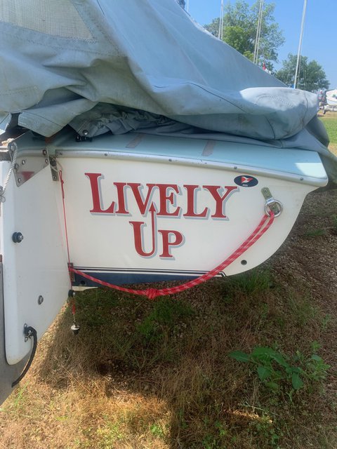 1993 Flying Scott "Lively Up" hull #4929 for sale. Visible under custom "Sailors' Tailor" cover and atop Trail Master trailer at FBYC (middle of FS row). Includes main, spinnaker, jib (2). Extra bits included, but not the curious dog. $5000 obo
